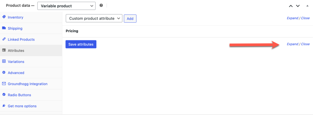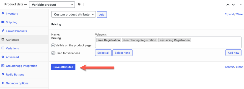 The default pricing attributes are already set. Make sure that “used for variations” is checked. Save the attributes, then select the Variations tab.