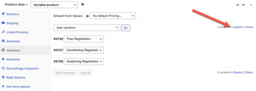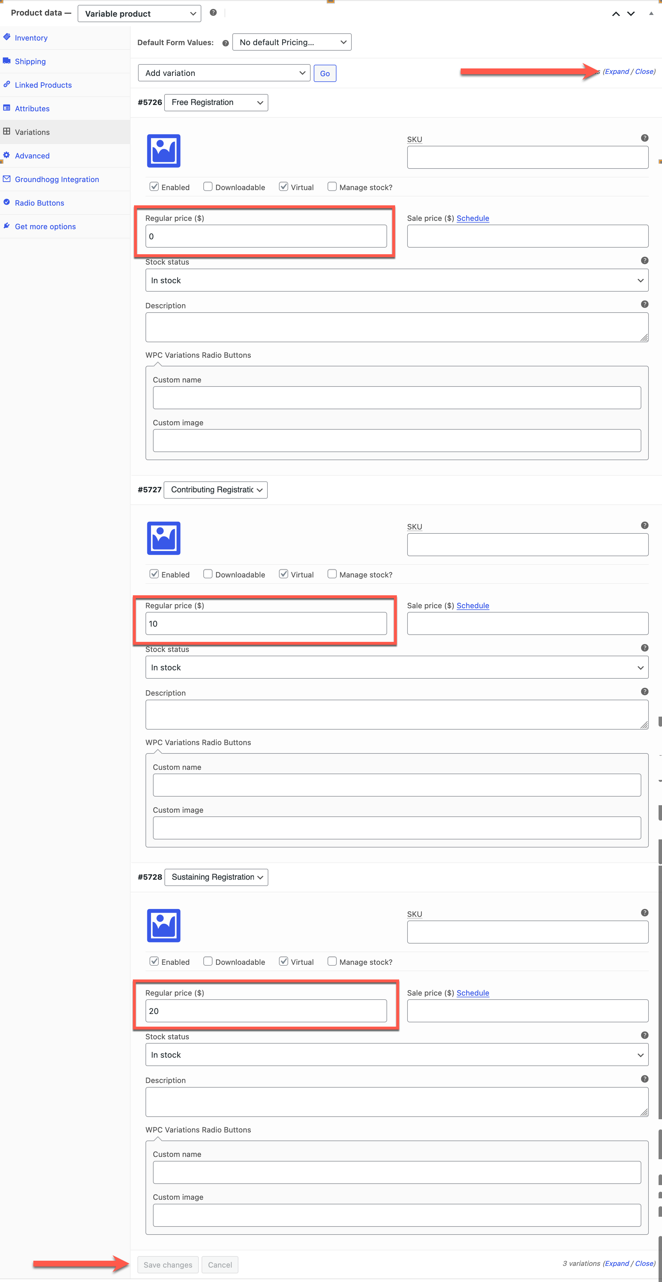 Expand the variations list, and edit the pricing for each variation. Don’t forget to save your changes using the button at the bottom of the variations dialog.