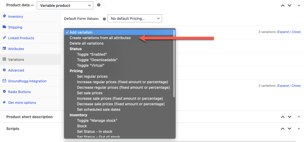 If you find that no variations have been created, just open the Add variation dropdown and select Create variations from all attributes.