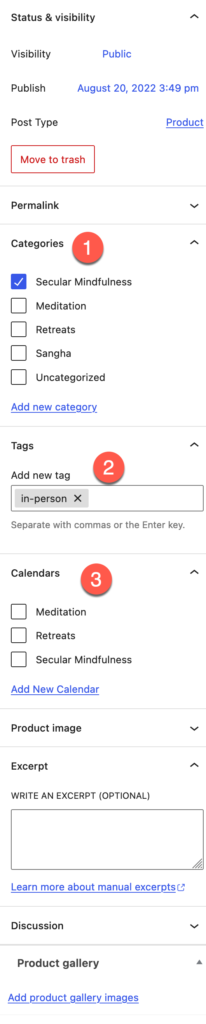 In the right-hand column, make sure you indicate the new program’s category (or categories), in-person or online tag, and the calendar(s) on which it appears.